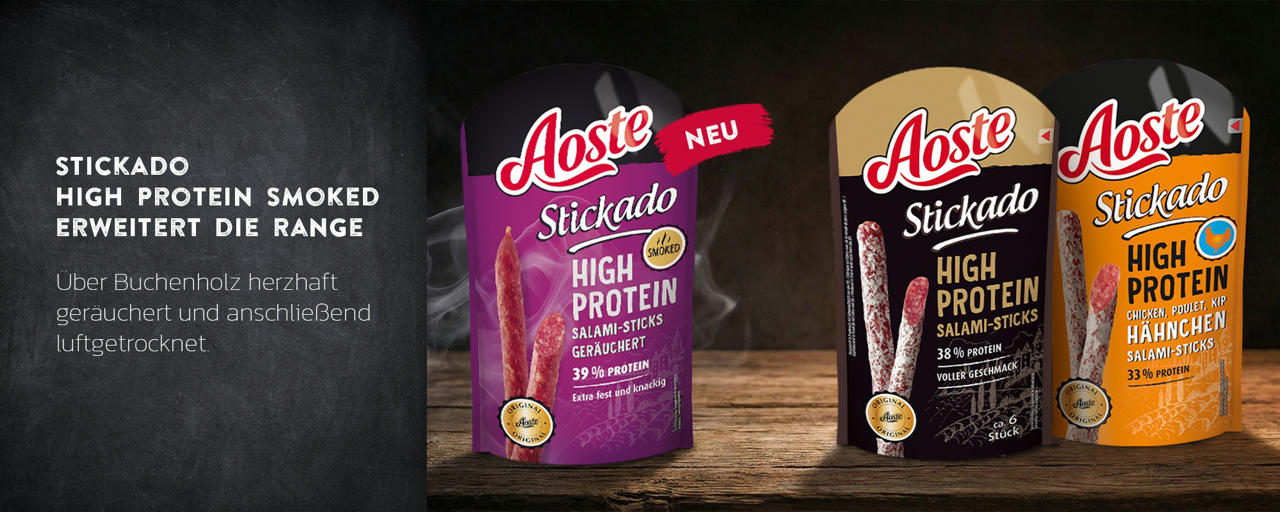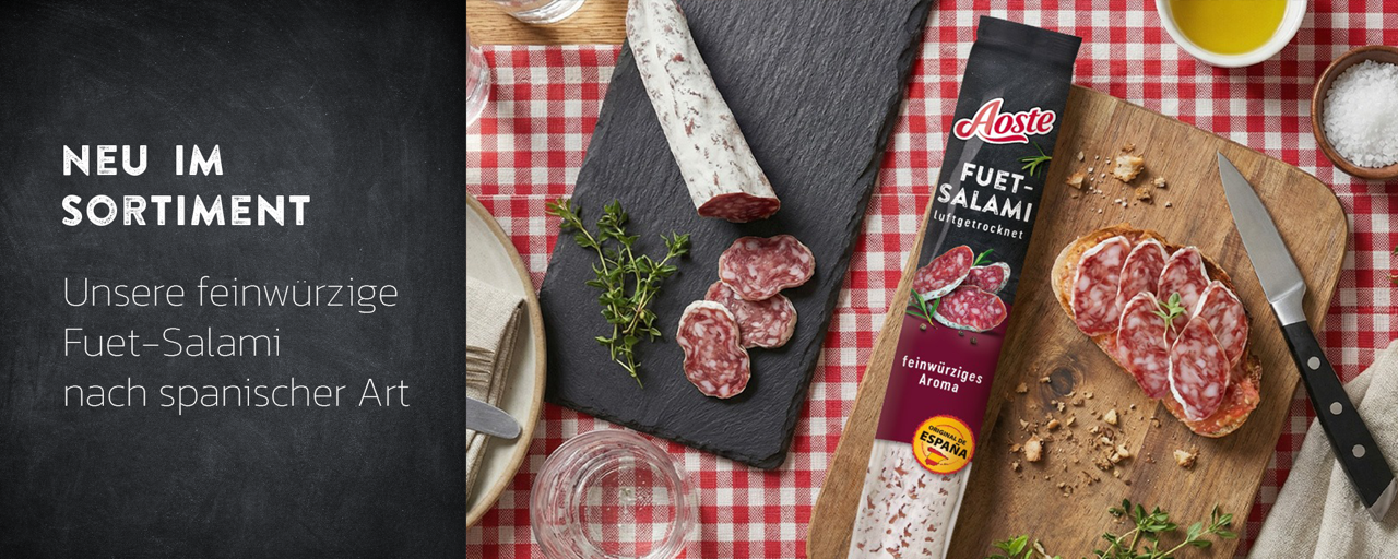 Salami-Spezialitäten in unserem leckeren Aoste Sortiment. Unsere Aoste Snacks, Aoste Aufschnitte, Aoste luftgetrocknete Delikatesse-Salami am Stück und unser Premium-Aoste Wurst in der Serviceauslage laden dich auf eine geschmackliche Genussreise ein. Hast du Lust die ganze Welt von Aoste kennenzulernen? Denn nur wo das Aoste Logo drauf ist, ist auch echte Qualität nach französischer Originalrezeptur drin.Aoste Hochgenuss auf dem Tisch seit 1976