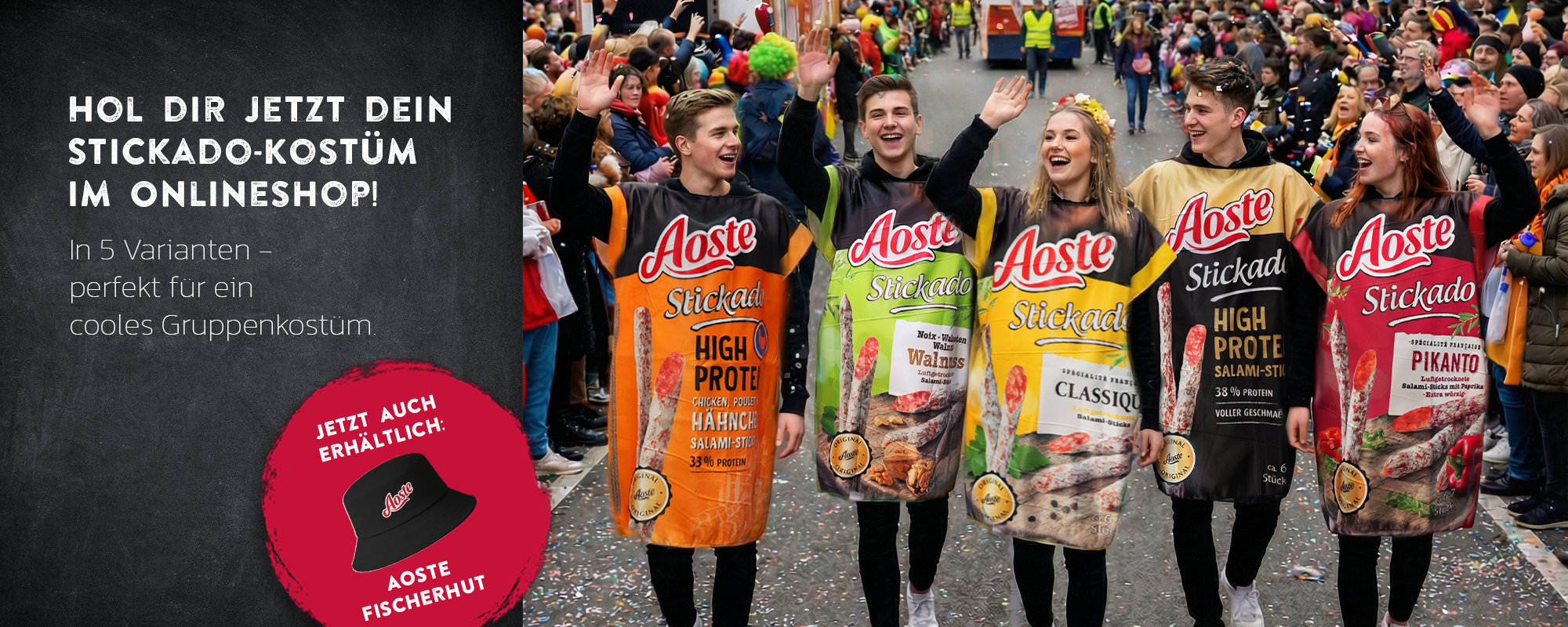 Schnapp dir ein Stickado-Kostüm und freu dich auf 10 % Sofortrabatt auf alle Stickado-Sorten, Stickado-Brot und Longhetti – ganz automatisch im Warenkorb.